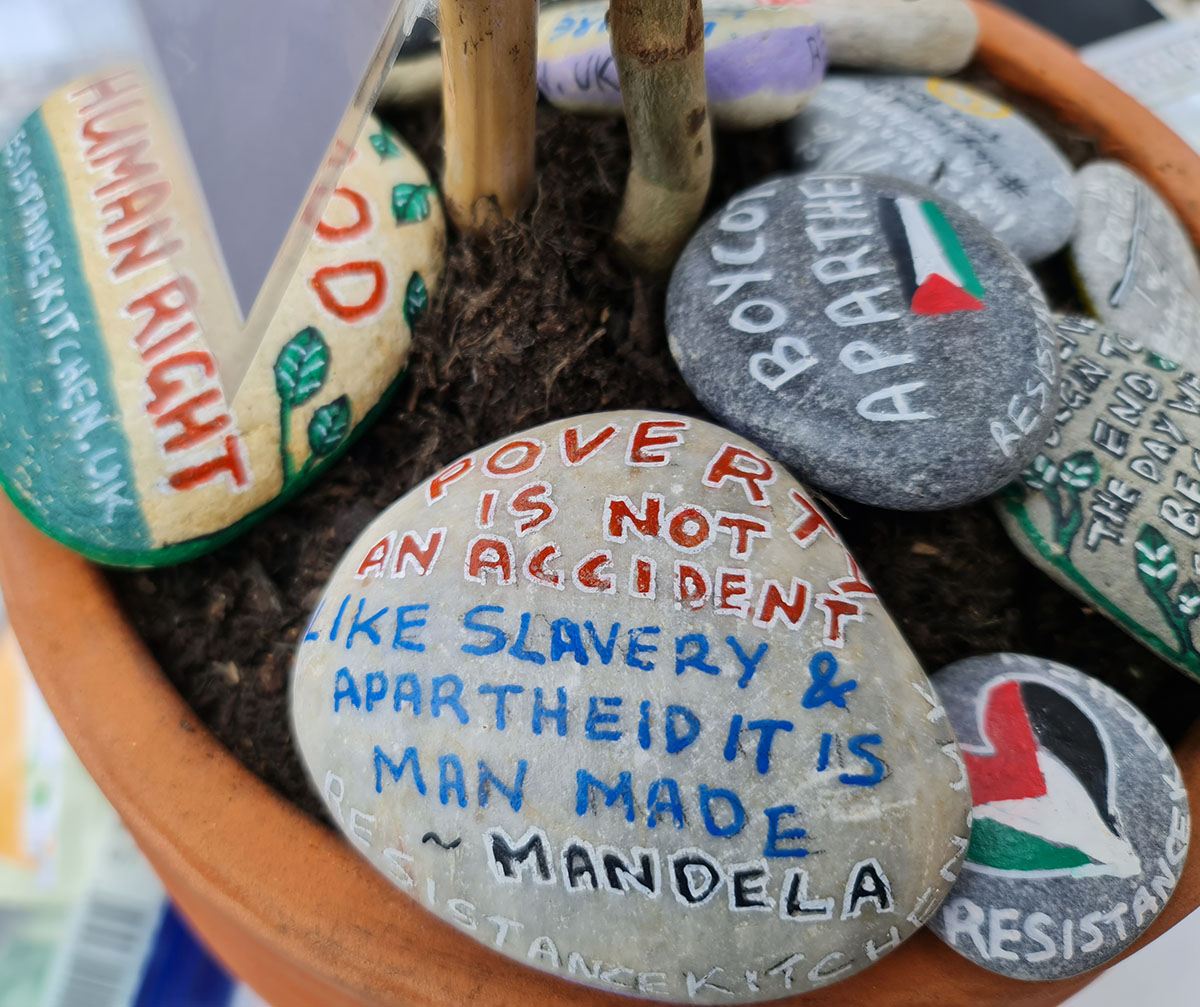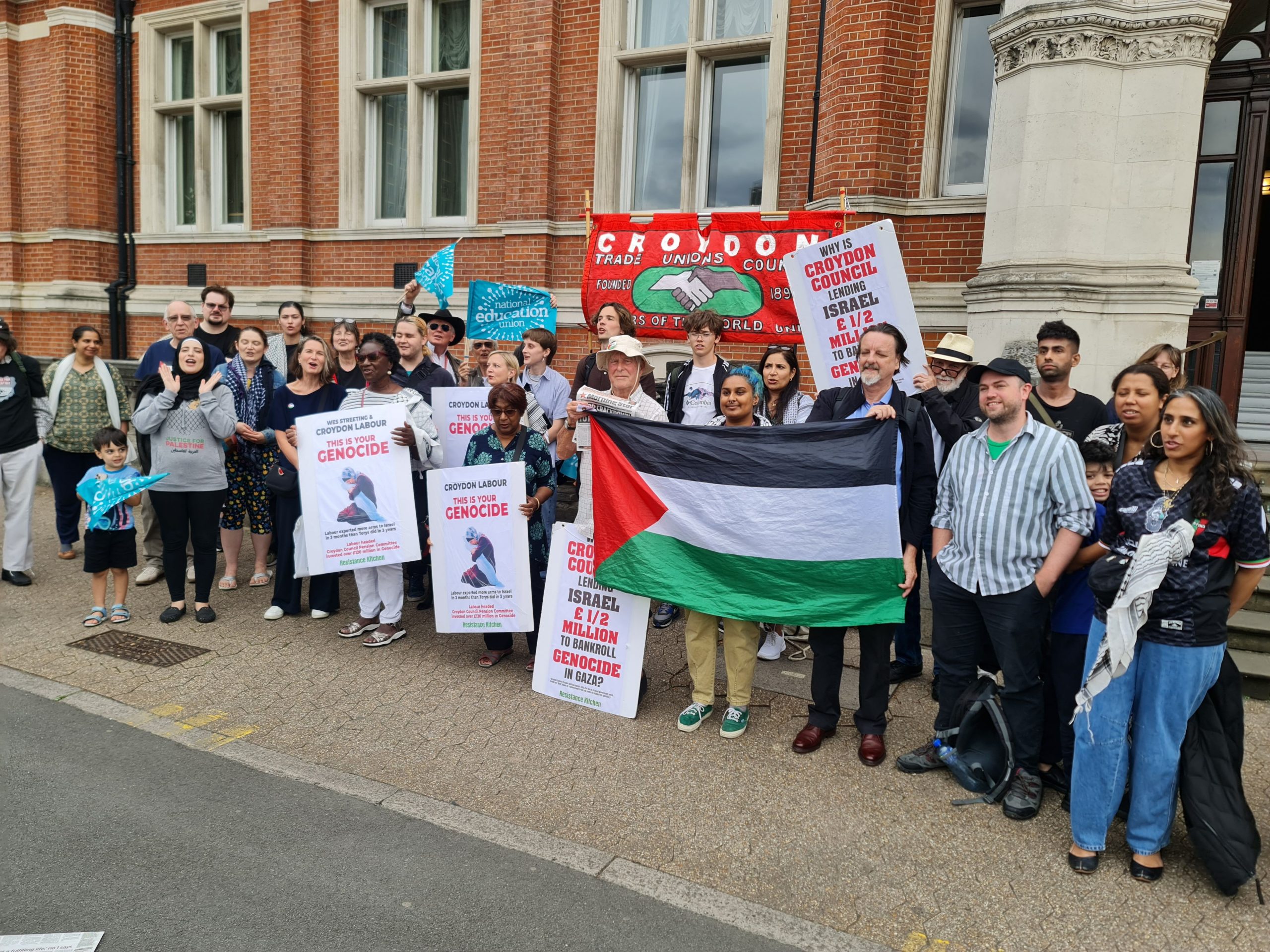 On 16 July the Croydon Divest Coalition, which includes the Resistance Kitchen, protested outside the town hall, where a full meeting of Croydon Council was taking place. The coalition is calling on Croydon council to divest from genocide.