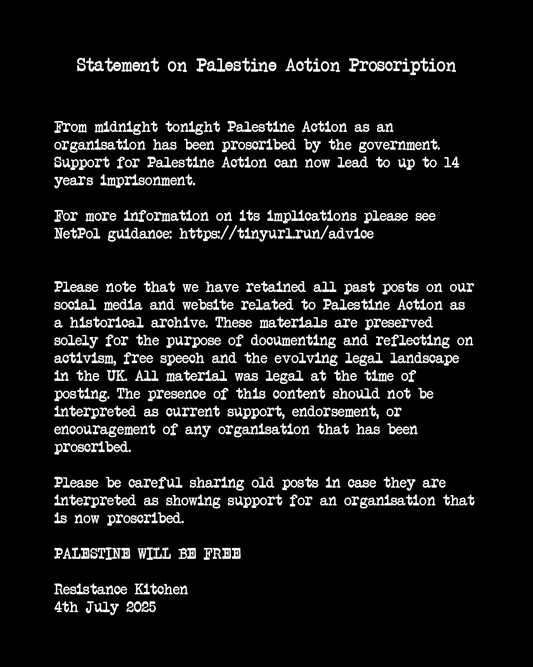 Statement On Palestine Action Proscription