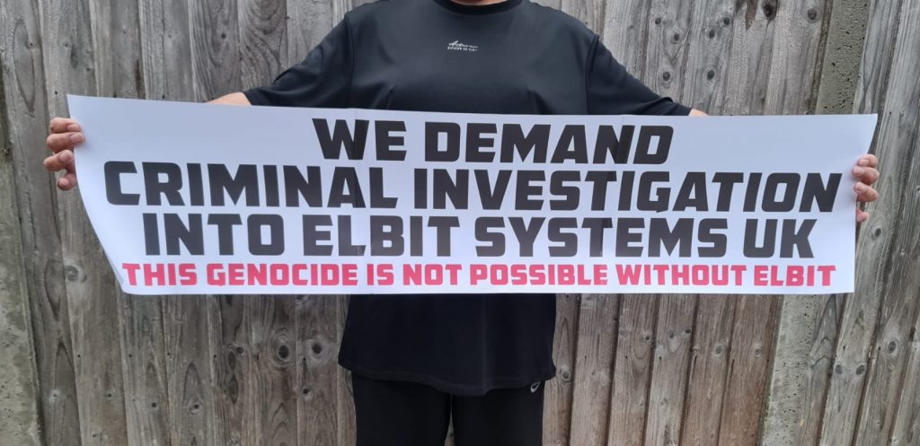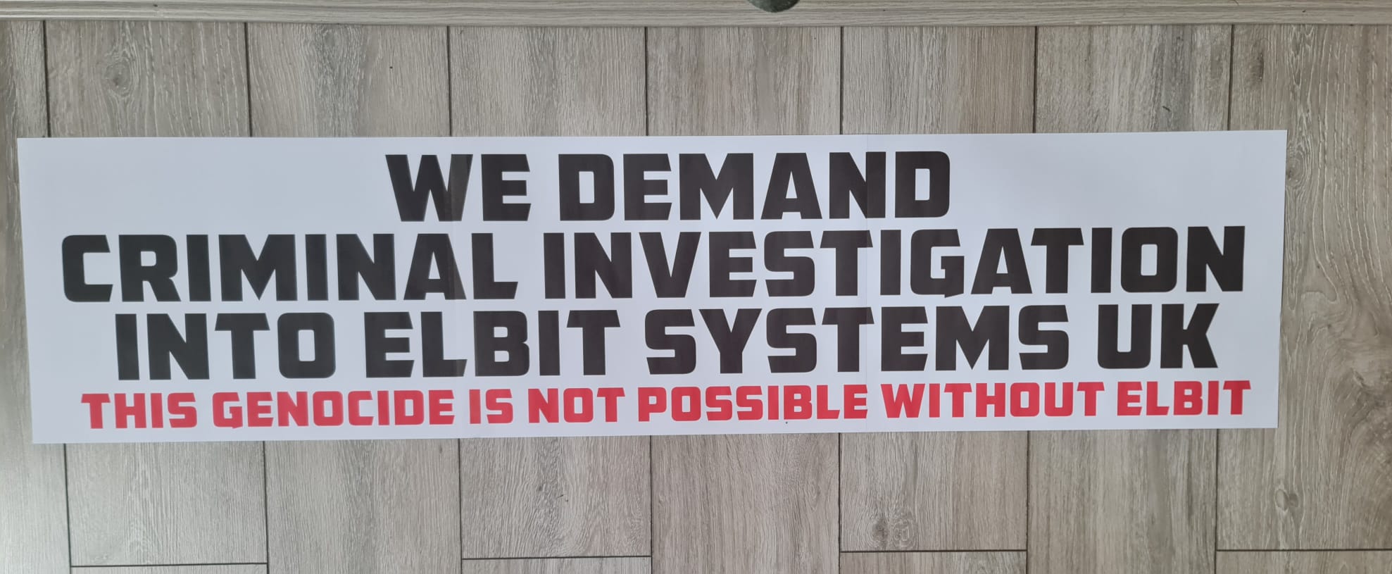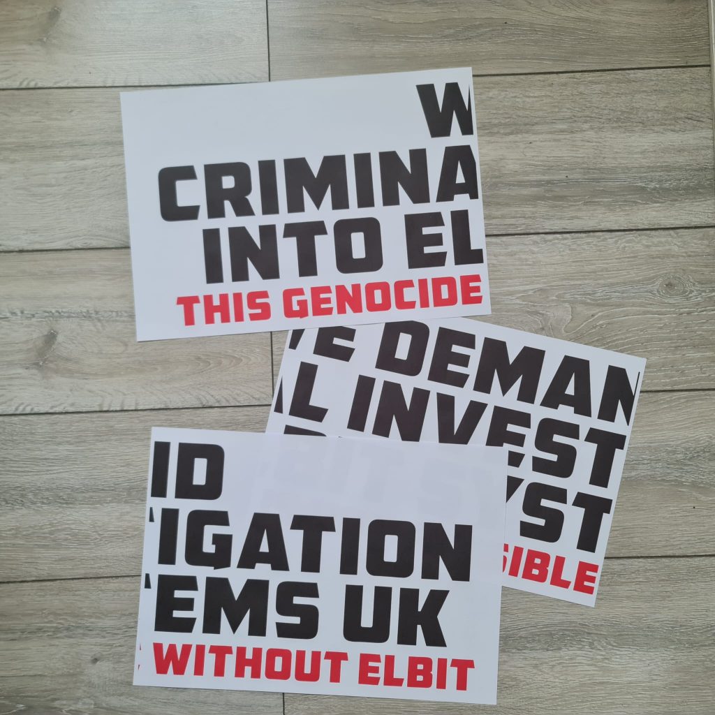 Alternatively we also have a printable A3 template that prints across 3 A3 sheets to make a simple but effective 4 feet paper banner that reads “We Demand Criminal Investigation Into Elbit Systems UK,” with “This Genocide Is Not Possible Without Elbit” below it. If using the paper banner, its best to ensure the delivery action is not on a rainy day.