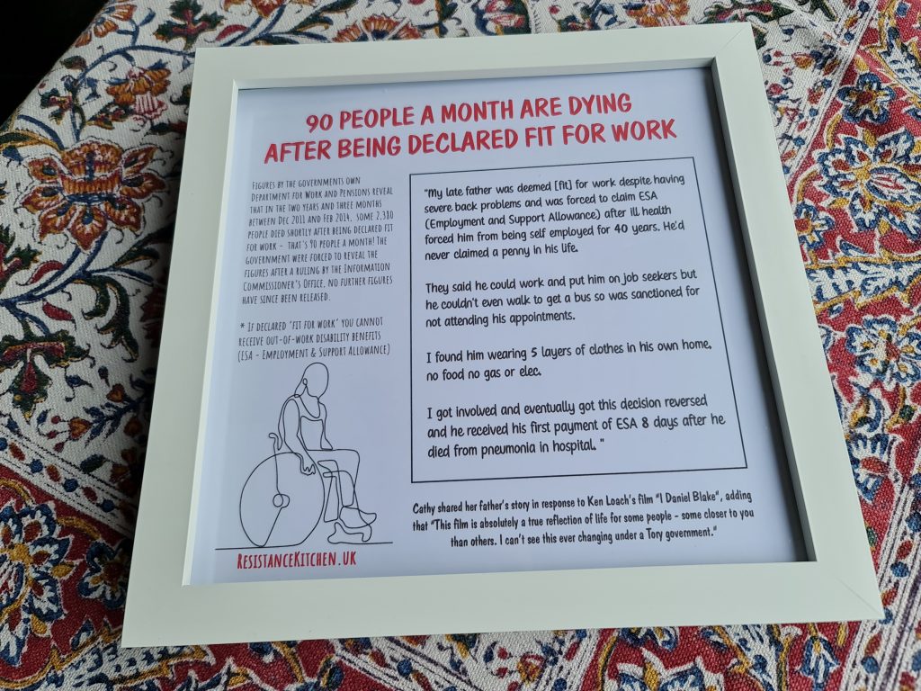 If declared ‘fit for work’ you cannot receive out-of-work disability benefits (ESA – Employment & Support Allowance), and are forced on to Job Seekers which requires you to prove you are looking for a job 35 hours a week, attend appointments, interviews, take any job offered – which in your condition you will not be able to do as you are not fit for work. You will then be punished (sanctioned), sometimes for months on end, when you will not receive any benefits whatsoever. No money to pay for rent, electricity, gas, council tax or food. This has lead to thousands of deaths.