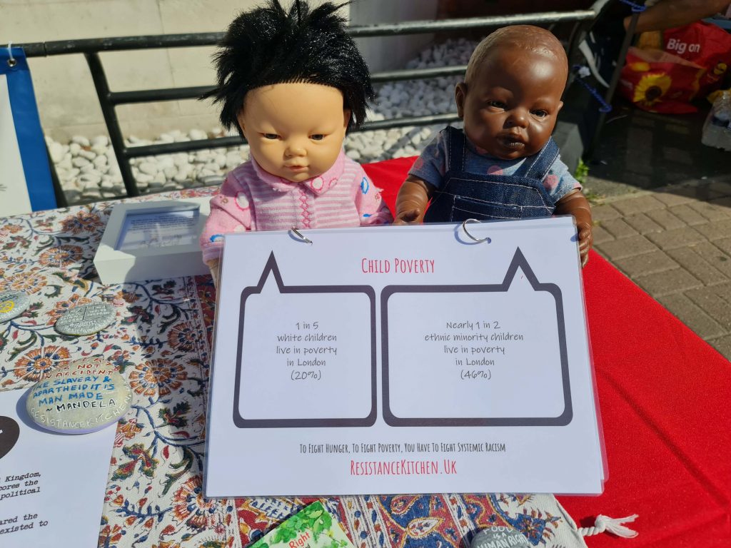 The exhibit titled “To fight hunger, to fight poverty, you have to fight systemic racism”, features two dolls – one white, one black. They were holding a 3 page flip book, speech bubbles on each page highlighting how different aspects of poverty impacts each child.