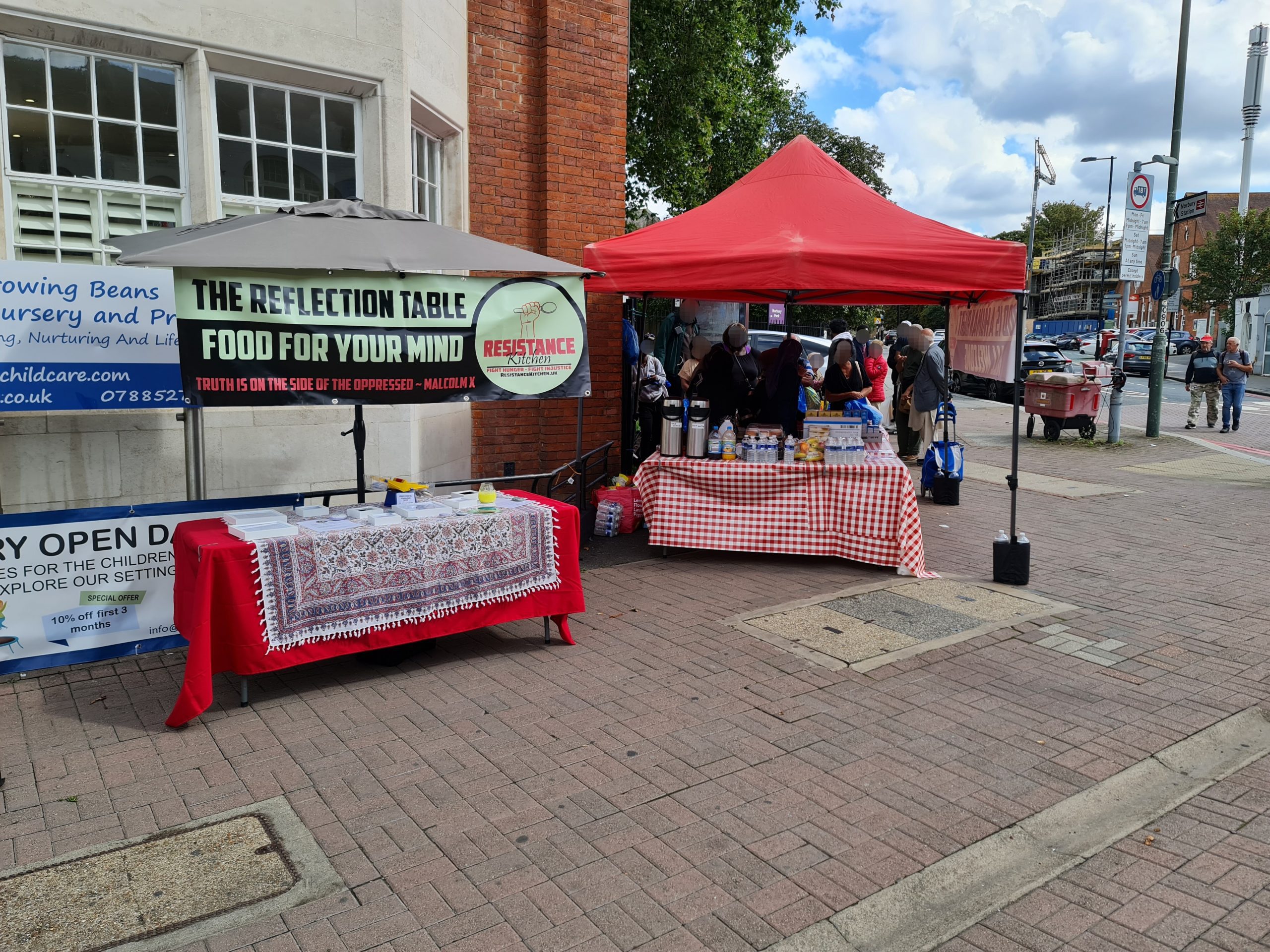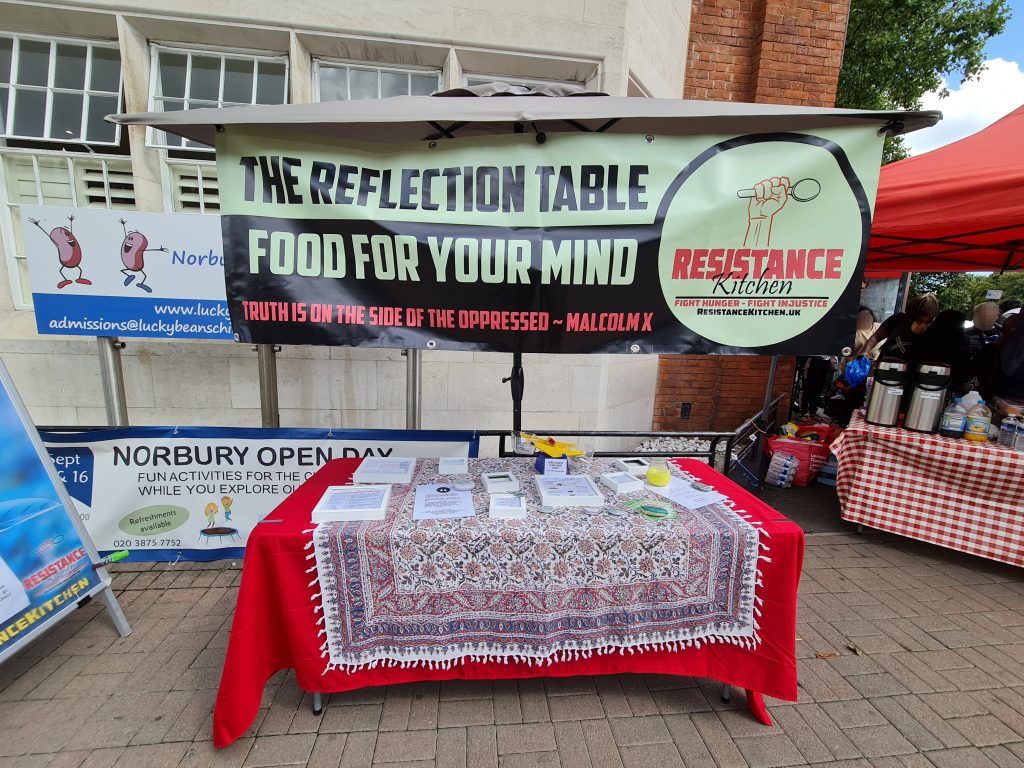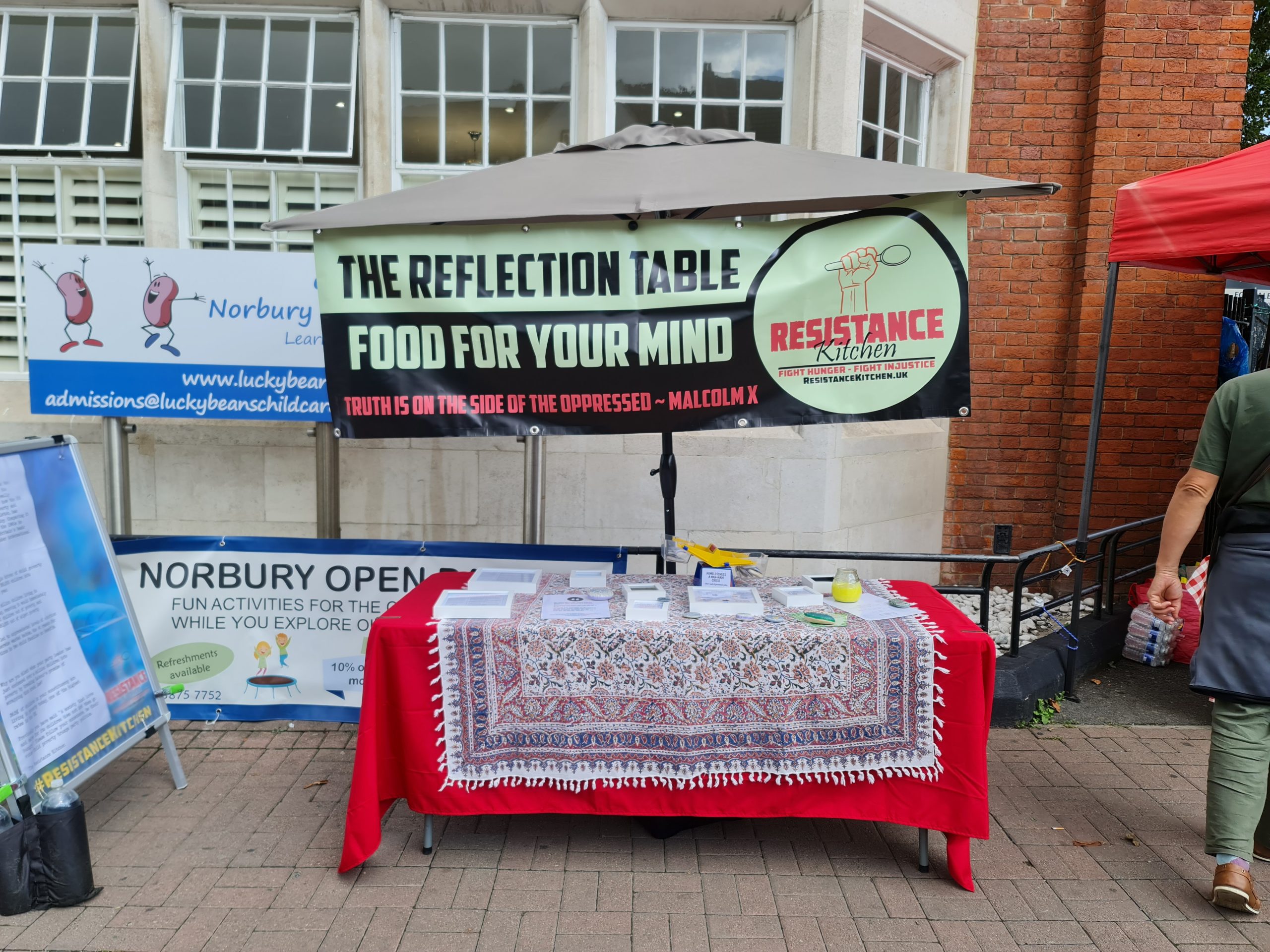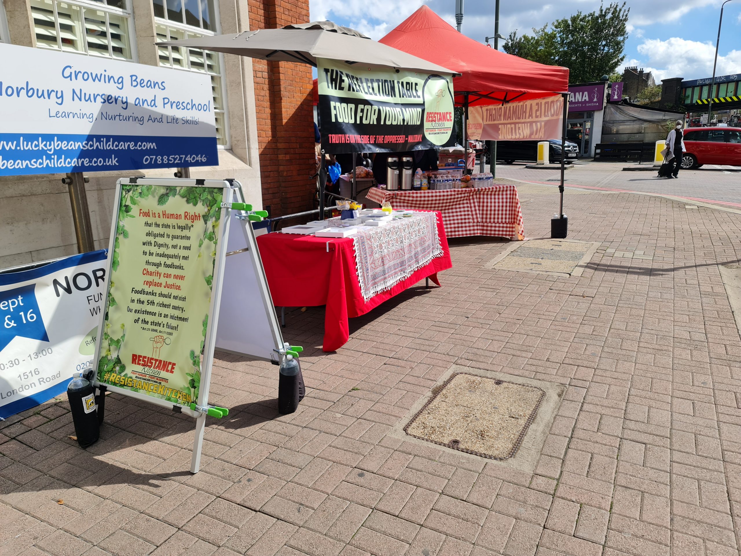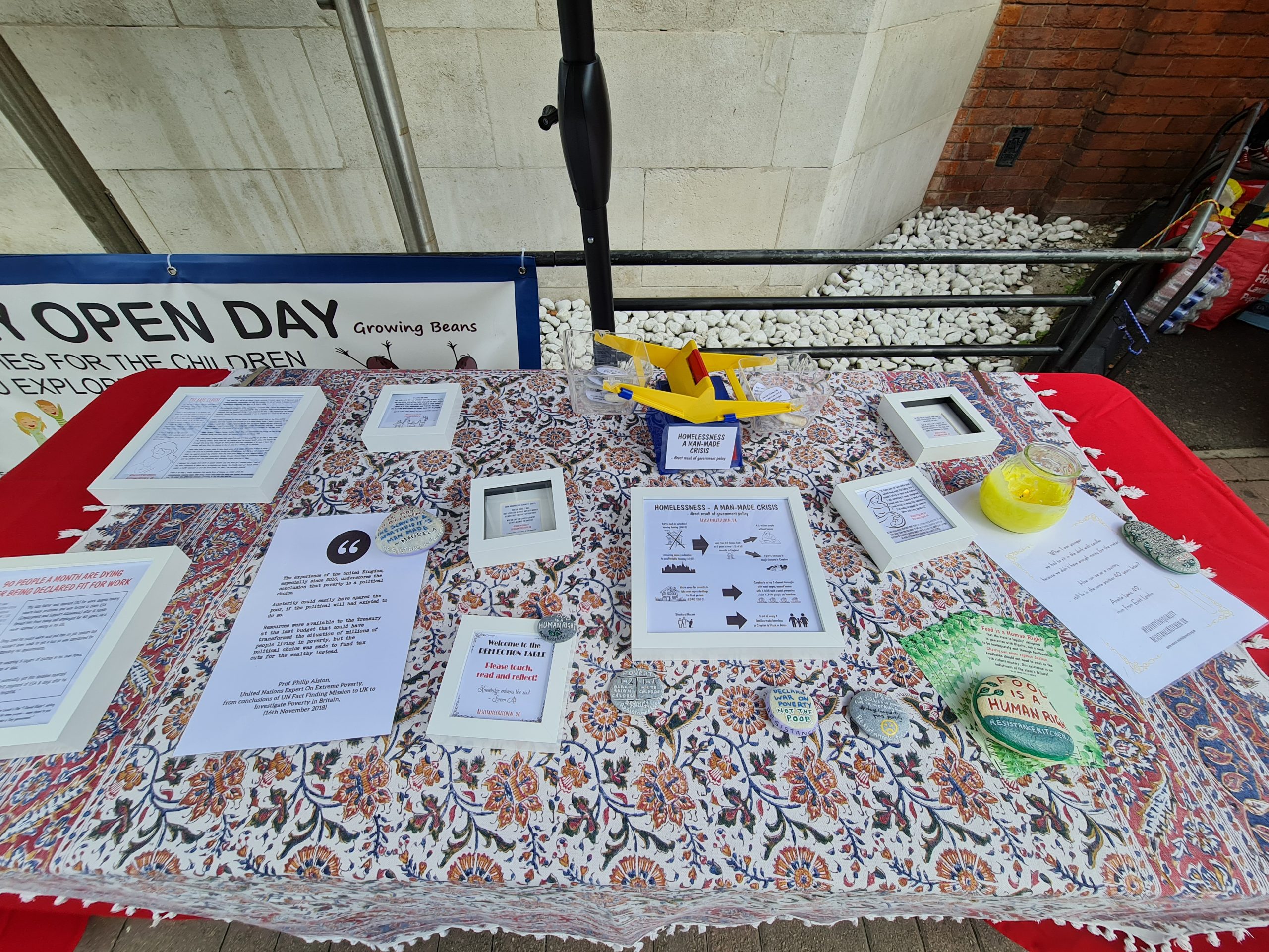 The Reflection Table now has a new 6ft signage “Food For Your Mind” to complement our ‘food for the body’ food stall. This has helped garner a lot more interest from the public. Many people came and looked at the display picking up frames to read peoples personal accounts of how austerity policies have impacted them, and took photos of it and the letter to our local MP displayed on the sandwich board next to it, which urges him not to support the two child policy which has pushed over a million children into poverty.